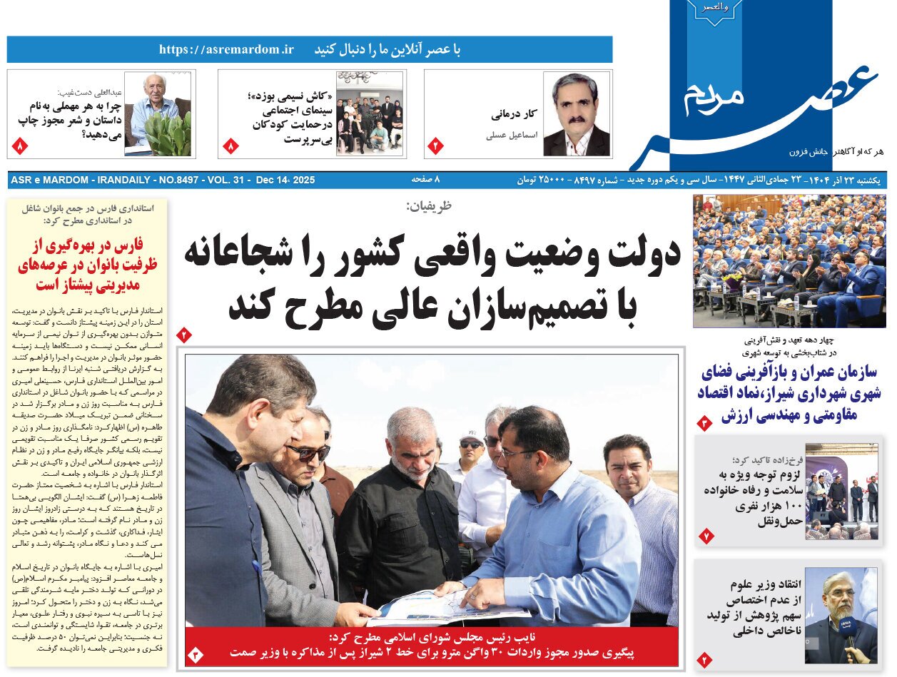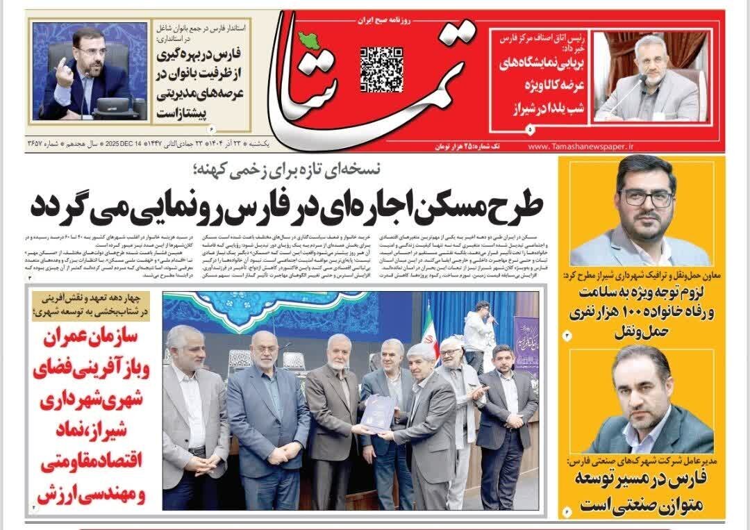 صفحه نخست روزنامه‌های استان فارس یکشنبه ۲۳ آذرماه ۱۴۰۴